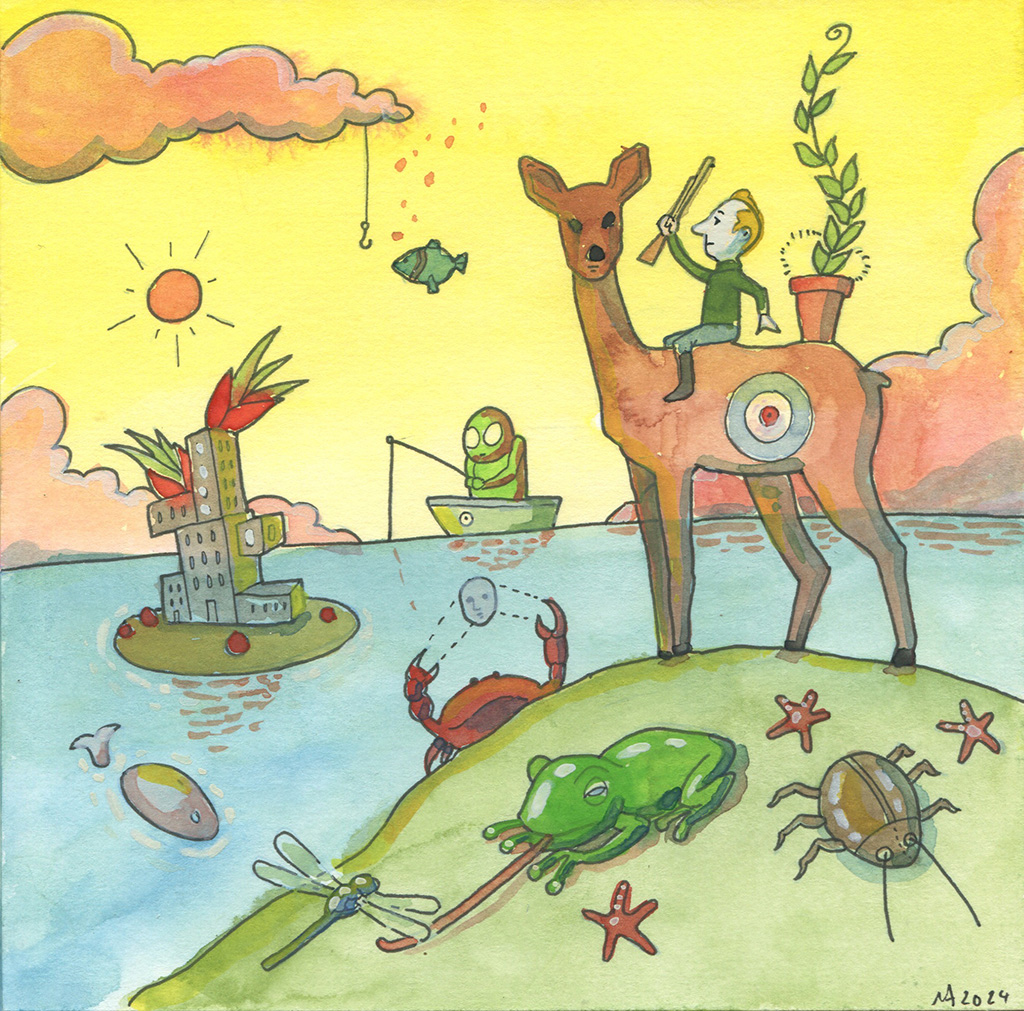 Weiterhin entstehen immer wieder freie Aquarelle. Hier zu sehen sind „Bommels“, „Go get Them!“ und „Shining at the Sea“